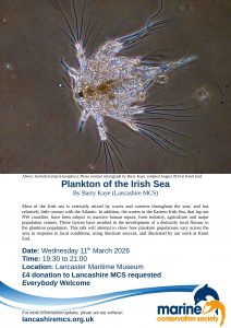 Most of the Irish Sea is vertically mixed by waves and currents and has limited exchange with the Atlantic. In the Eastern Irish Sea, which borders our coastline, waters are influenced by significant human inputs — from industry, agriculture, and major population centres. These factors create a distinctly local plankton community. Barry’s talk will explore how plankton populations vary across the region, drawing on scientific literature and illustrated with findings from Knott End.